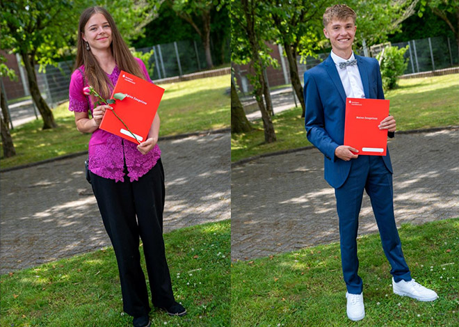 Frau Schmidt – stolze Mutter einer Abiturientin – ging auf die Elternsicht zur Schulzeit ein und würdigte, dass alle Schülerinnen und Schüler sich den Herausforderungen des Abiturs gestellt hätten. Besondere Leistungen in einzelnen Fächern wurden von Frau Flathmann und den Tutorinnen und Tutoren geehrt, und auch bei der Zeugnisausgabe durch die Tutorinnen und Tutoren gab es bewegende und emotionale Momente. 15 der 45 Abiturientinnen und Abiturienten erreichten eine „1 vor dem Komma“ und erhielten dafür einen Buchpreis vom Förderverein. Das beste Abitur wurde in diesem Jahr von Hanke Dirksen mit der Traumnote 1,0 erreicht. Charise Isabelle Streitz folgte mit der Note 1,1. Insgesamt lag der Durchschnitt bei 2,3 – ein Ergebnis, das sich wahrlich sehen lassen kann.
