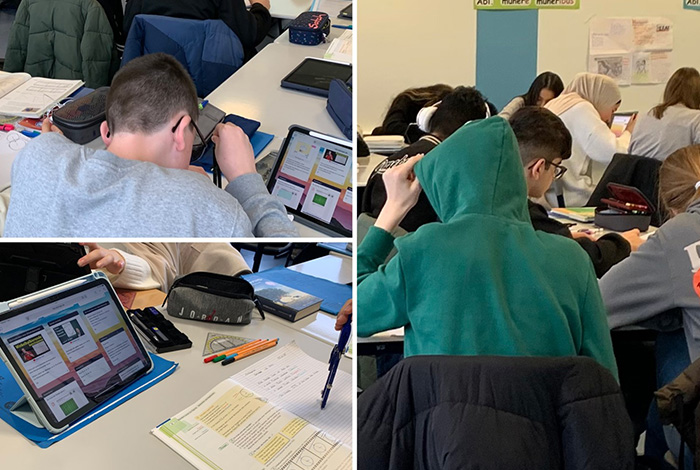 Schon seit letzter Woche beschäftigen sich die Schüler*innen der Klasse G8a im Mathematikunterricht mit dem Thema „Besondere Linien bei Figuren“ – und das auf ganz besondere Weise. Statt klassischem Frontalunterricht erarbeiten sie sich die Inhalte selbstständig mit Hilfe ihrer Tablets.