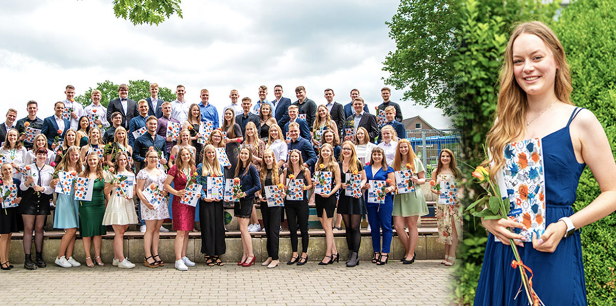 Die Abiturientinnen und Abiturienten des Abschlussjahrgangs 2022 und rechts die beste Schülerin Lara-Sophie Hinrichs mit einem Schnitt von 1,0.
